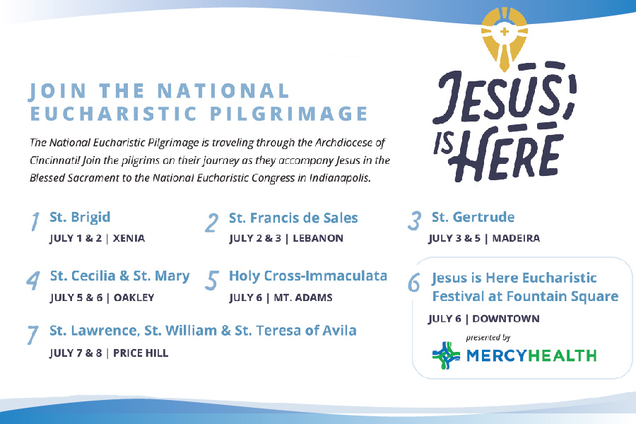 The National Eucharistic Pilgrimage is passing through the Archdiocese of Cincinnati from July 1-8. For details about how to travel as a “day pilgrim” or attend one of the special events, go to
